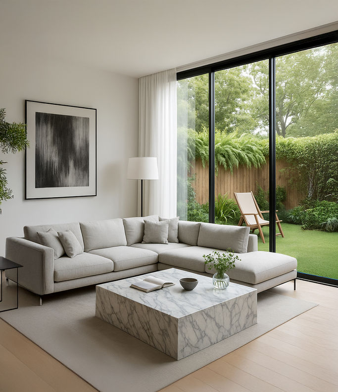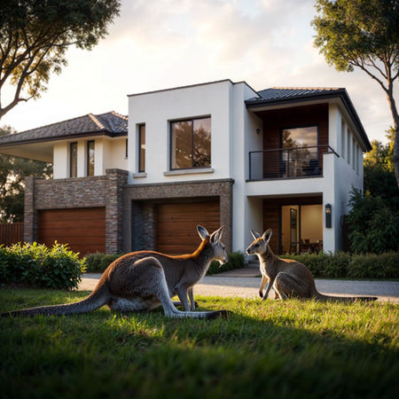 Contemporary Australian house design shaped by light, landscape, and quiet openness. Open-plan interiors flow through timber and stone, dissolving into the outdoors through wide glass walls and shaded terraces. In the foreground, a lone kangaroo stands still, a gentle reminder that this modern home belongs to the wild Australian horizon.